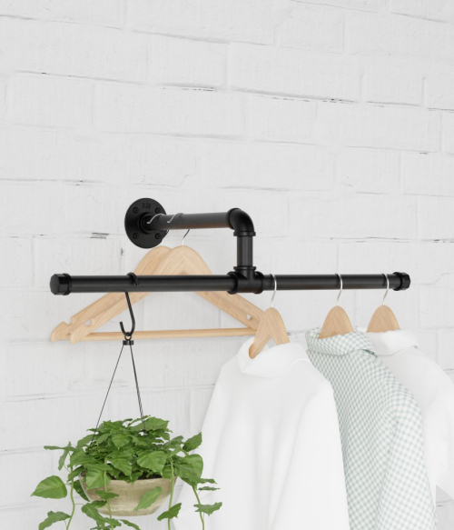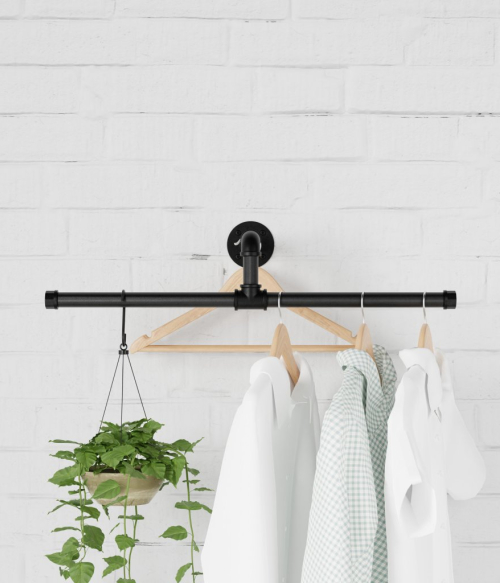 Das Set beinhaltet eine röhrenförmige Struktur, dank der ein praktischer Helfer zum Aufhängen von Kleidung auf Kleiderbügeln entsteht. Dank seines industriellen Aussehens wird es ein originelles Element von Räumen wie Umkleidekabinen, Schlafzimmern, Eingangshallen oder Badezimmern sein.