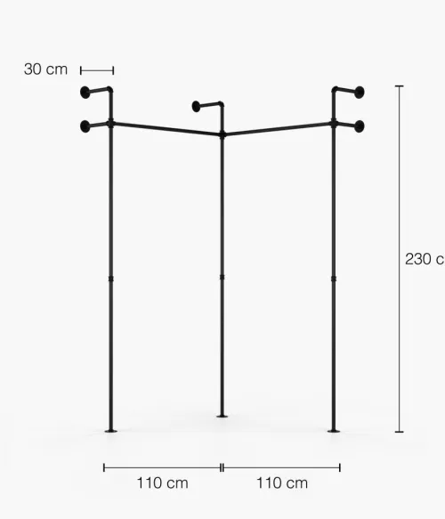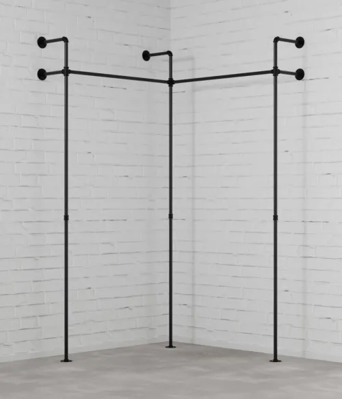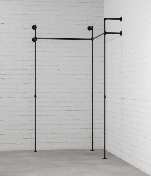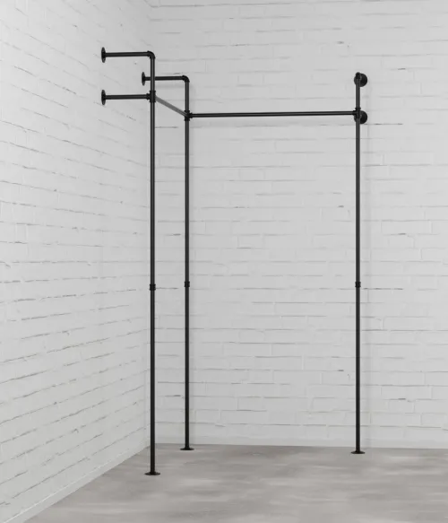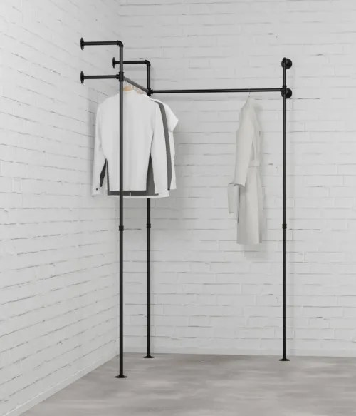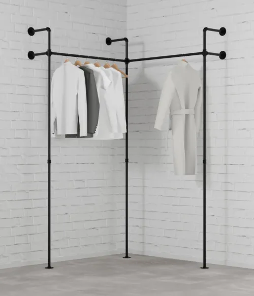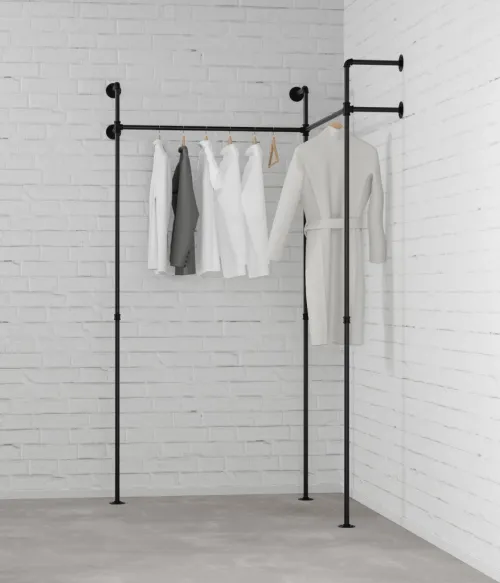 Garderobni komplet DARIO II CORNER višine 2300 mm iz cevnega sistema Rusticline bo naredil posebne vaše garderobe, predsobe, spalnice ali trgovine z oblačili. Zaradi svoje variabilnosti se bo podala v vsak prostor.