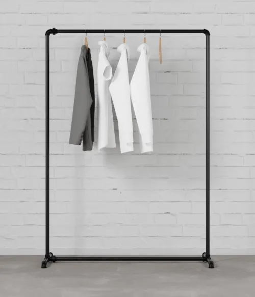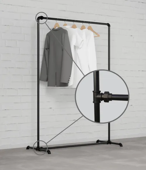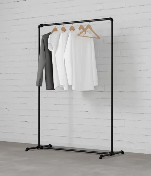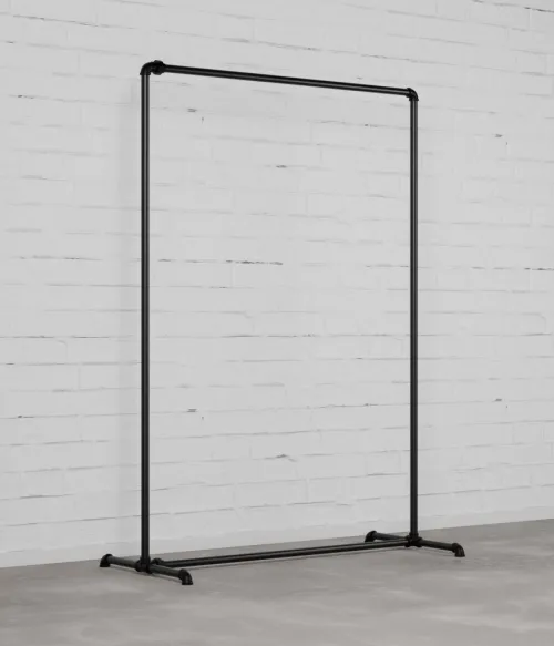 1580 mm visok obešalnik FREJA II iz cevnega sistema Rusticline bo naredil vaše garderobe, predsobe, spalnice ali trgovine z oblačili posebne. Zahvaljujoč svoji variabilnosti se prilega vsakemu prostoru, stojalo lahko kadarkoli premaknete kamor koli želite.