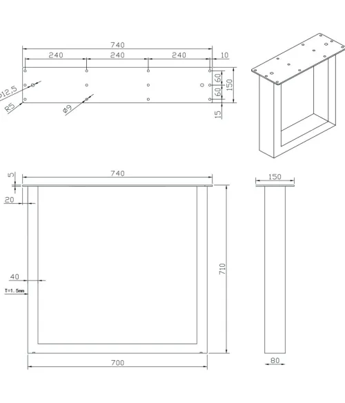 Okvirji so izdelani iz zaprtega jeklenega profila 80 × 40 mm. V zgornjem delu (debelina 1,5 mm) so pripravljene montažne luknje, ki omogočajo enostavno in varno pritrditev na leseni del pohištva.